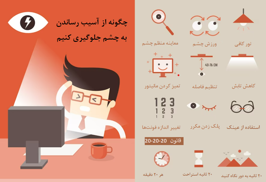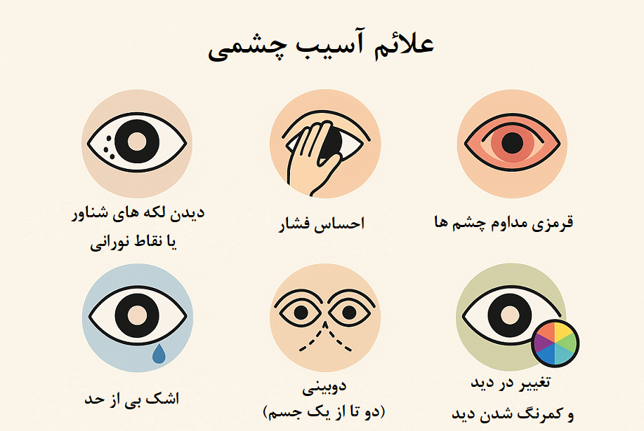 - سردردهای مکرر بعد از کار با موبایل یا کامپیوتر: این سردردها معمولاً ناشی از فشار روی چشمها و عضلات اطراف آنها هستند.- خستگی یا درد اطراف چشم: چشمهای خسته اغلب با درد یا سنگینی در اطراف کاسه چشم همراه هستند و نیاز به استراحت دارند.- حساسیت به نور: اگر نور محیط باعث ناراحتی چشمها شود، نشاندهندهی تحریک یا خستگی آنها است.این علائم نشان میدهند که چشم شما نیاز به استراحت، مراقبت بیشتر و رعایت نکات بهداشتی دارد تا از مشکلات جدیتر جلوگیری شود. حتی رعایت چند دقیقه استراحت یا پلک زدن آگاهانه در طول روز میتواند تفاوت بزرگی ایجاد کند.دلایل ایجاد آسیب چشمی- استفاده طولانیمدت از صفحهنمایش: تمرکز مداوم بر صفحه موبایل یا رایانه باعث خستگی عضلات چشم و کاهش توان تطابق میشود، بهویژه زمانی که استراحت کافی وجود نداشته باشد.- کاهش پلک زدن: هنگام کار با وسایل دیجیتال، افراد معمولاً کمتر پلک میزنند؛ این موضوع موجب تبخیر سریعتر اشک و در نتیجه خشکی، سوزش و احساس جسم خارجی در چشم میشود.- تابش نور آبی: نور آبی ساطعشده از صفحهنمایشها در طول زمان میتواند به سلولهای شبکیه آسیب وارد کند و همچنین با تأثیر بر هورمون ملاتونین، نظم خواب را بر هم زند.- نور نامناسب محیط: کار در محیطهای بسیار تاریک یا بیشازحد روشن، تطابق چشم را دشوار میکند و موجب خستگی سریعتر و حساسیت به نور میشود.- فاصله و زاویه نادرست دید: نگاهکردن از فاصلهی نزدیک یا زاویهی غیر استاندارد (مثلاً پایینتر یا بالاتر از سطح چشم) فشار فیزیکی و بینایی را افزایش میدهد.- نبود استراحت کافی: نادیدهگرفتن زمانهای استراحت بین کار با وسایل دیجیتال، منجر به تجمع خستگی در عضلات چشم و بروز علائمی مانند تاری دید و سردرد میشود.افزایش خطرات در صورت بیتوجهی به علائمبیتوجهی به علائم اولیه ممکن است باعث افزایش شدت خستگی چشم و بروز عوارض جدیتر شود. اگر این روند ادامه پیدا کند، احتمال ابتلا به مشکلاتی مانند خشکی مزمن چشم، کاهش دقت بینایی و حتی آسیب به شبکیه وجود دارد. در برخی افراد، این فشار مداوم میتواند منجر به سردردهای مزمن یا تاری دید موقت شود. علاوه بر این، استفاده از موبایل در محیطهای تاریک یا با فاصلهی بسیار نزدیک، فشار مضاعفی بر عضلات چشم وارد میکند و باعث کاهش تطبیقپذیری بینایی در طول زمان میشود. بنابراین، مراقبت از چشم در زمان استفاده زیاد از موبایل و کامپیوتر نهتنها یک توصیهی عمومی، بلکه یک ضرورت برای حفظ سلامت بینایی است.راهکارهای عملی برای مراقبت از چشم1. تنظیم روشنایی و زاویه صفحهنور صفحه و زاویه مانیتور باید متناسب با محیط باشد تا چشمها کمتر خسته شوند. روشنایی صفحه باید تقریباً همسطح با نور محیط باشد و از نور مستقیم خورشید یا چراغهای شدید روی صفحه جلوگیری کنید. استفاده از فیلتر نور آبی یا حالت شب روی موبایل و لپتاپ میتواند به کاهش خستگی چشم کمک کند.2. پلک زدن بیشترهنگام کار با موبایل یا کامپیوتر، معمولاً تعداد پلک زدن کاهش مییابد. کمبود پلک زدن باعث خشکی و سوزش چشمها میشود. برای رفع این مشکل، سعی کنید آگاهانه پلک بزنید یا چند ثانیه چشمها را ببندید. این کار باعث میشود چشمها همیشه مرطوب بمانند و از خشکی جلوگیری شود.3. استفاده از قطرههای اشک مصنوعیقطرههای اشک مصنوعی به کاهش خشکی و سوزش چشم کمک میکنند و برای افرادی که مدت طولانی با صفحه کار میکنند، بسیار مفید هستند. قبل از مصرف، بهتر است با چشمپزشک مشورت کنید تا نوع قطره مناسب برای شما تعیین شود.4. تمرینات چشمتمرینات ساده میتوانند فشار عضلات چشم را کاهش دهند. به عنوان مثال:- چرخش چشم به سمت بالا، پایین، چپ و راست- تمرکز متناوب روی اشیاء نزدیک و دور- حرکت چشمها به صورت دایرهای آراماین تمرینها باعث افزایش انعطافپذیری عضلات چشم و کاهش خستگی میشوند.5. فاصله مناسب از صفحهفاصله بین چشم و صفحه مانیتور باید حداقل ۴۰-۵۰ سانتیمتر باشد. برای موبایل، بهتر است دستگاه کمی پایینتر از سطح چشم نگه داشته شود و از نزدیک کردن بیش از حد 
