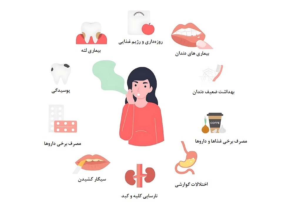 - بیماری‌های سیستمیک: دیابت، نارسایی کلیه یا کبد در برخی موارد باعث ایجاد بوی خاص در دهان می‌شوند.