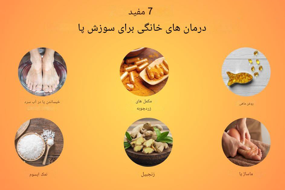 درمان خانگی برای سوزش پا برای کاهش ناراحتی ناشی از سوزش پا، میتوانید از روشهای مختلفی در خانه استفاده کنید. برخی از راهکارهای خودمراقبتی عبارتاند از: 1. روغن ماهی: استفاده از روغن ماهی میتواند به کاهش التهاب و سوزش پا کمک کند.2. مکملهای زردچوبه: زردچوبه دارای خواص ضدالتهابی است و میتواند در بهبود سوزش پا موثر باشد.3. قرار دادن پاها در آب سرد: خیساندن پاها در آب سرد به مدت 15-20 دقیقه میتواند به کاهش علائم موقتی کمک کند. پاها را خنک کنید. بهتر است پاهای خود را به مدت 15 دقیقه در آب خنک - نه یخزده - قرار دهید تا بهطور موقت علائم کاهش یابد. استفاده از یک فن برای جریان هوای خنک هم میتواند موثر باشد.4. ماساژ: ماساژ مناطق مبتلا به سوزش پا میتواند به بهبود گردش خون و تسکین درد کمک کند.5. زنجبیل: زنجبیل نیز دارای خواص ضدالتهابی است و میتواند در کاهش سوزش پا موثر باشد.6. نمک اپسوم: استحمام پاها در آب گرم حاوی نمک اپسوم میتواند به کاهش التهاب و درد کمک کند.7. خیساندن در آب سرد: مانند مورد سوم، خیساندن پاها در آب سرد به مدت 15-20 دقیقه میتواند به کاهش موقت علائم کمک کند.این درمانهای خانگی میتوانند به عنوان راهحلهای موقتی و مکمل درمان پزشکی مورد استفاده قرار گیرند. در صورت تداوم و شدت علائم، مراجعه به پزشک متخصص توصیه میشود. همچنین لباسهای راحت و کفش مناسب میتواند به بهبود وضعیت پاها کمک کند.در محیطی خنک بخوابید. تنظیم دمای اتاق خواب بین 18 تا 20 درجه سانتیگراد میتواند احساس بهتری در شب برای شما به همراه داشته باشد.