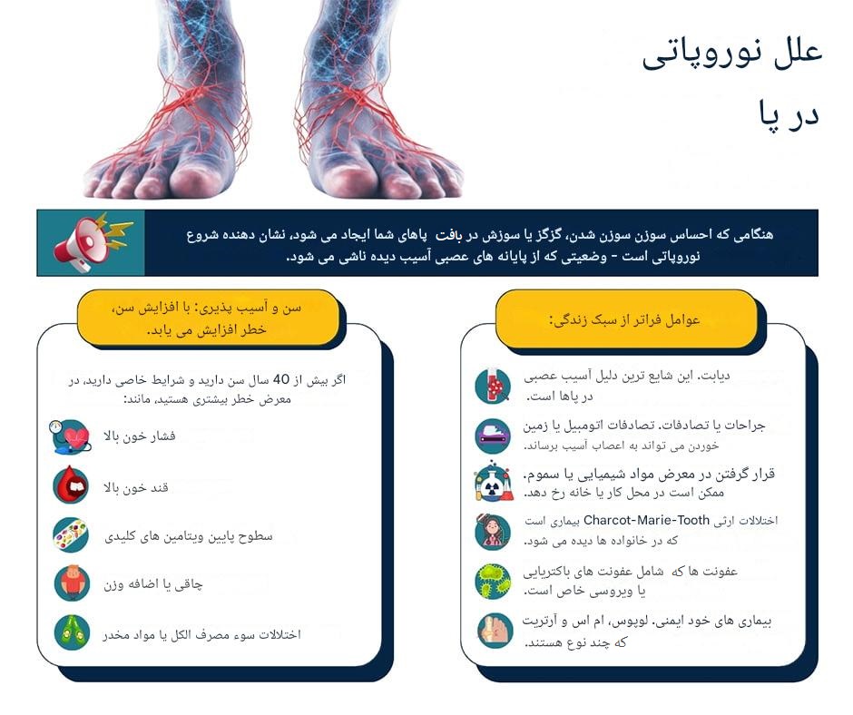 عوامل مؤثر بر نوروپاتی در پابرخی از عوامل مؤثر بر نوروپاتی در پا عبارتند از:1. دیابت: دیابت شایعترین علت آسیب عصبی در پاها است.2. جراحات و تصادفات: آسیب به اعصاب در اثر تصادفات اتومبیل، زمین خوردن و موارد مشابه.3. قرارگیری در معرض مواد شیمیایی و سموم: این مواد میتوانند در محل کار یا در خانه باعث آسیب به اعصاب شوند.4. اختلالات ارثی مانند Charcot-Marie-Tooth: بیماری ارثی شارکو ماری توث میتواند به آسیب عصبی منجر شود.5. عفونتها: عفونتهای باکتریایی یا ویروسی میتوانند به آسیب اعصاب بیانجامند.6. بیماریهای خودایمنی: بیماریهایی مانند لوپوس، اماس و آرتریت میتوانند به نوروپاتی منجر شوند.7. افزایش سن: با بالا رفتن سن، خطر ابتلا به نوروپاتی افزایش مییابد.8. عوامل زمینهای: شرایطی مانند فشار خون بالا، قند خون بالا، کمبود ویتامینها و چاقی میتوانند خطر ابتلا به نوروپاتی را افزایش دهند.